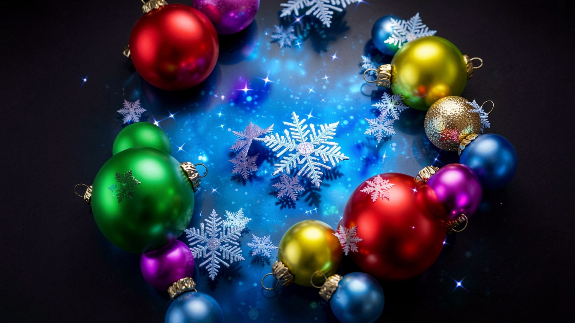 Разноцветные елочные шары и снежинки на синем фоне