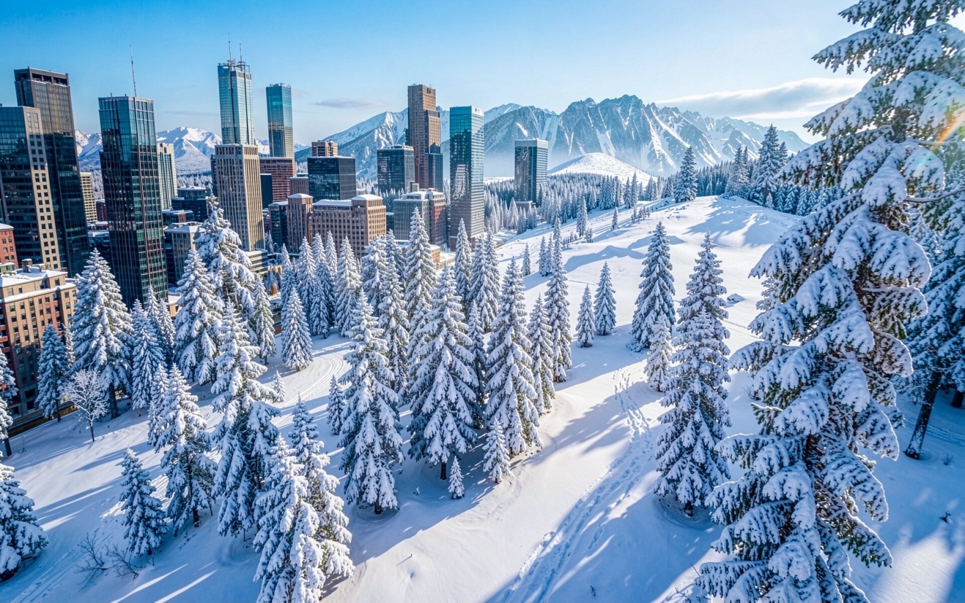 Зимний город с заснеженными елями и горами