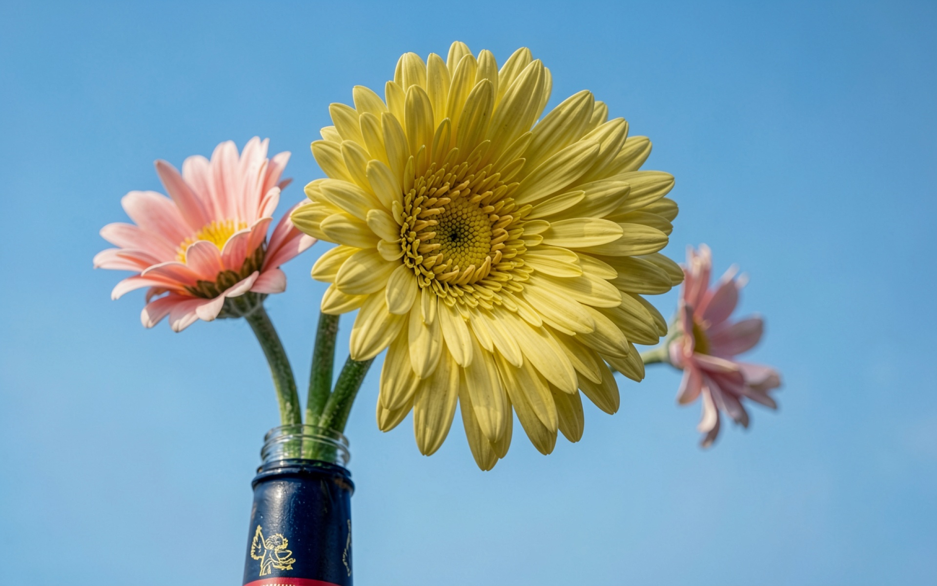 Желтая и розовая герберы в синей бутылке