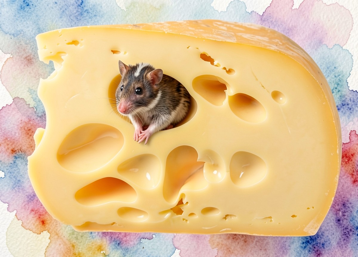 Маленькая мышь в куске желтого сыра
