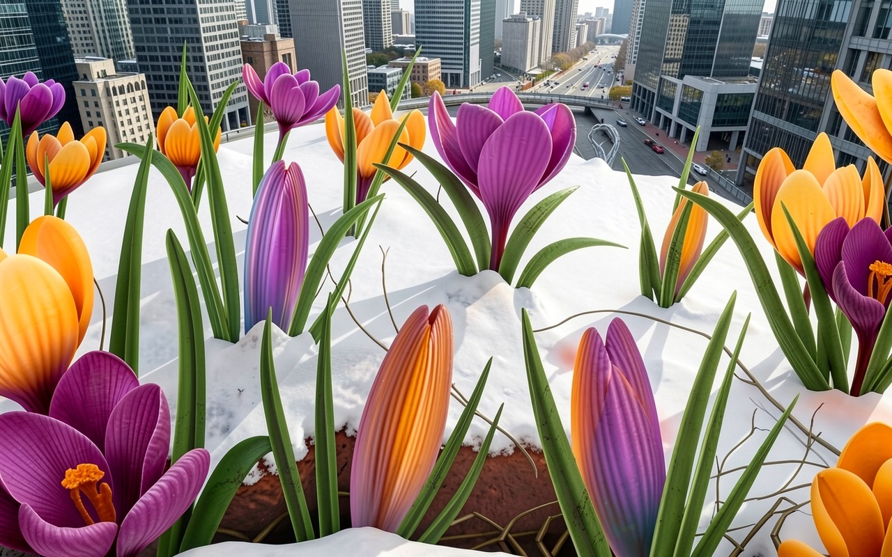 Крокусы фиолетового и желтого цвета в снегу