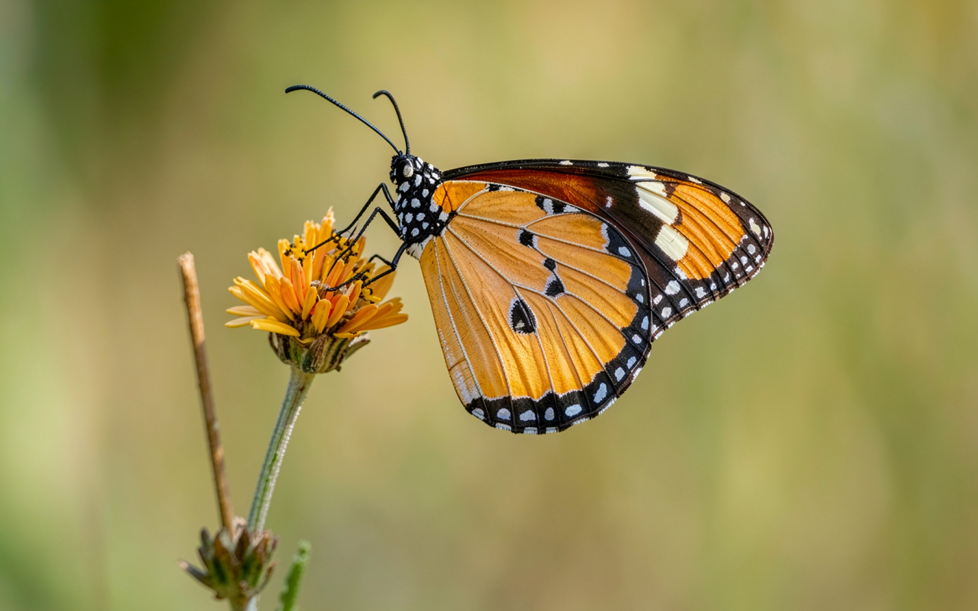 Оранжевая бабочка на желтом цветке в природе
