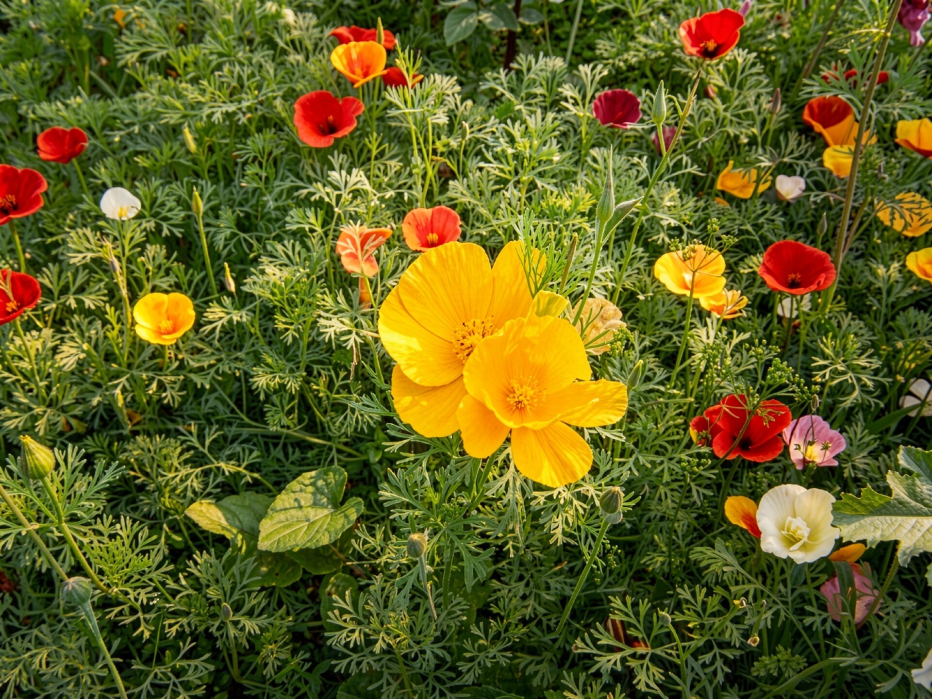 Желтые маки в зеленом саду при свете