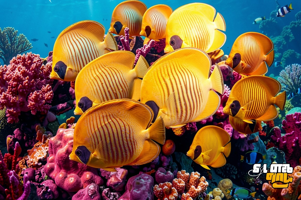 Желтые рыбы-бабочки среди розовых коралловых рифов