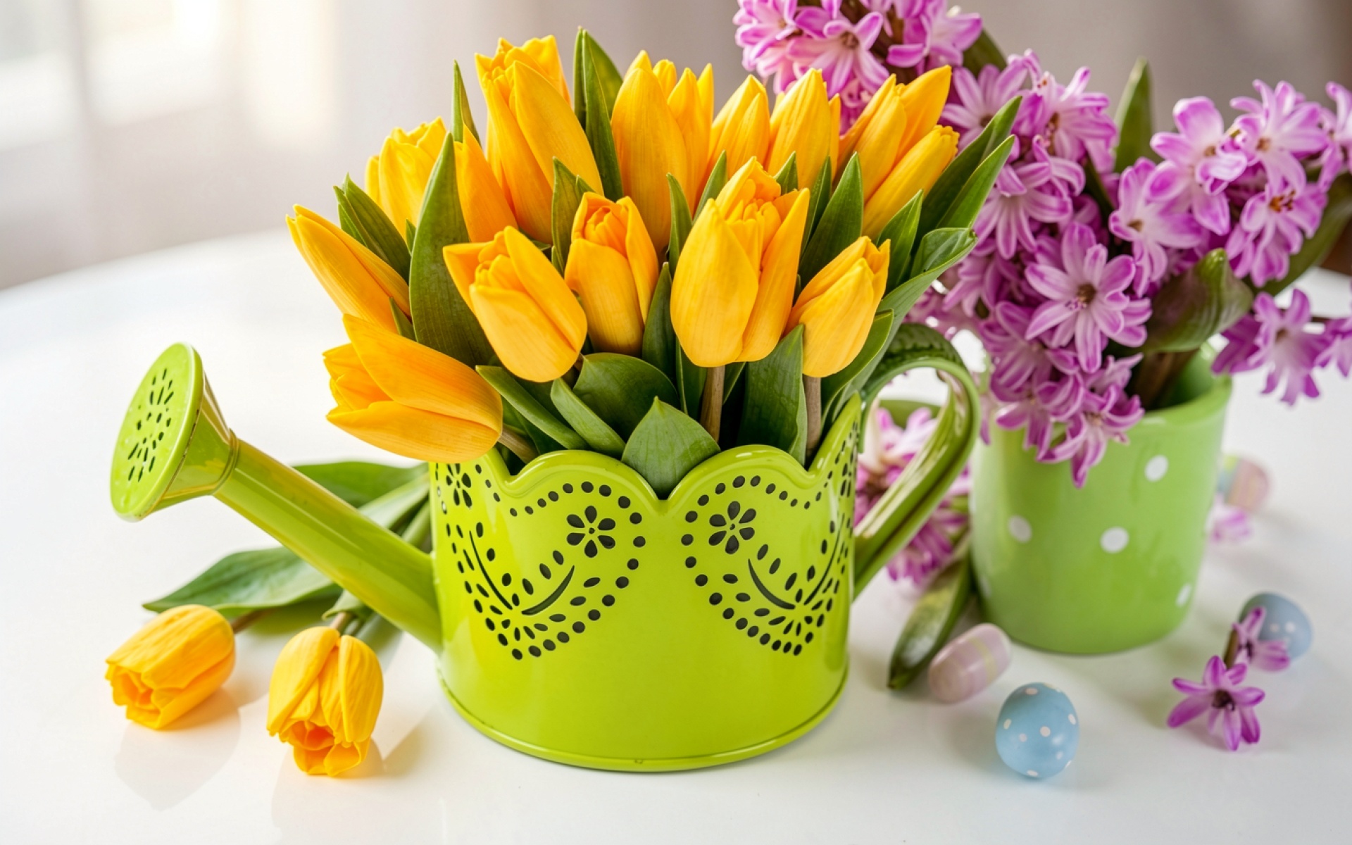 Желтые тюльпаны в зеленом лейке на столе