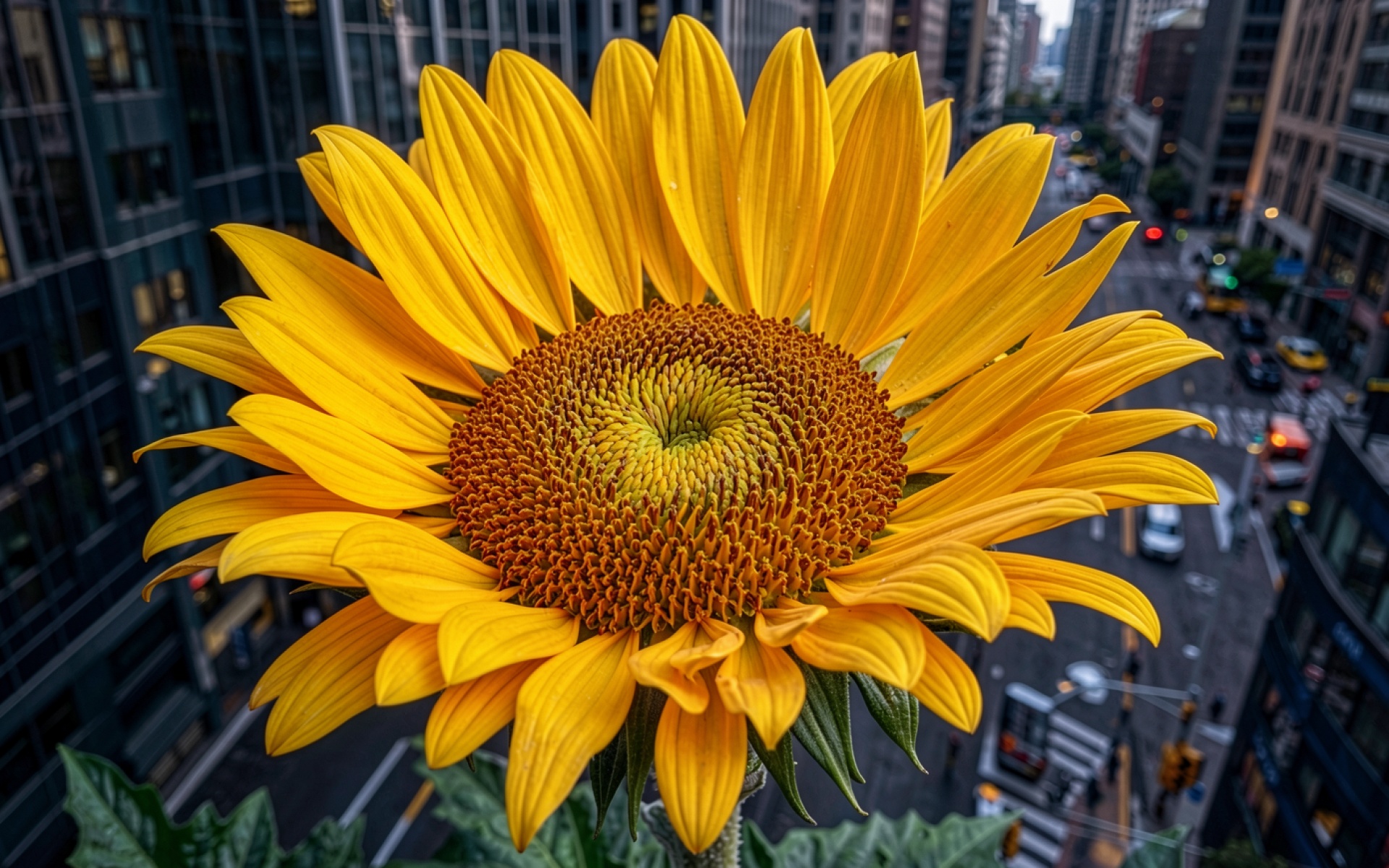 Желтый подсолнух на фоне городского пейзажа