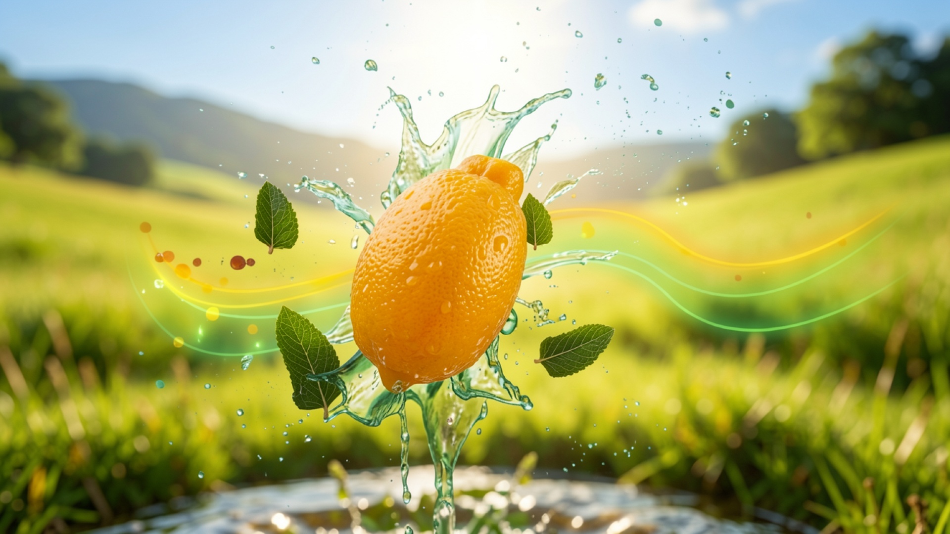 Желтый лимон в брызгах воды на лугу
