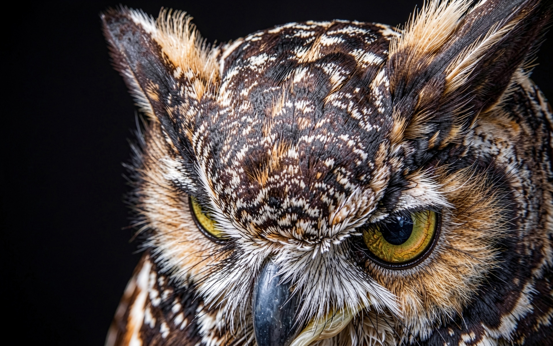 Портрет совы с желтыми глазами на черном фоне