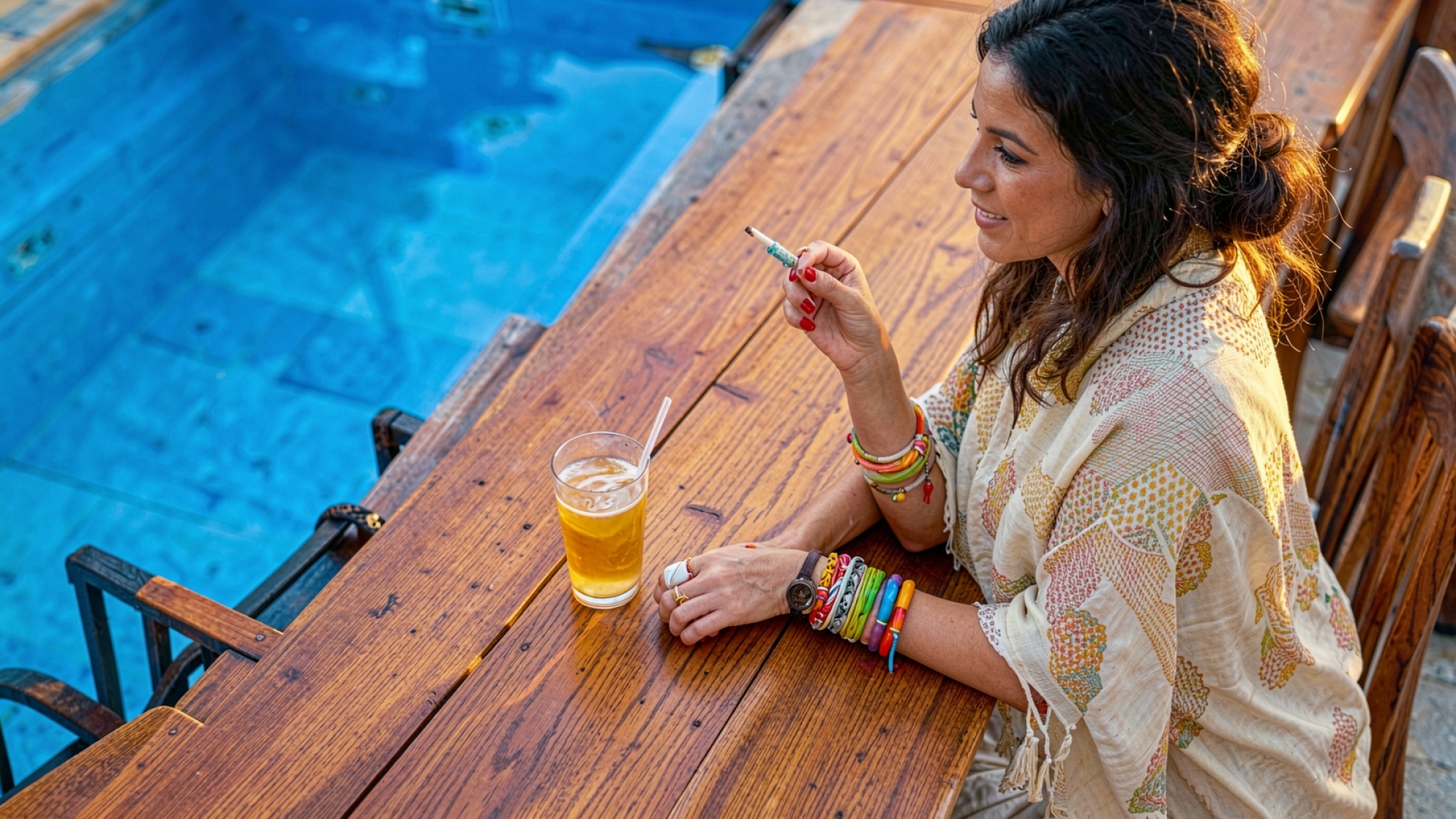 Женщина в белом кимоно у бассейна