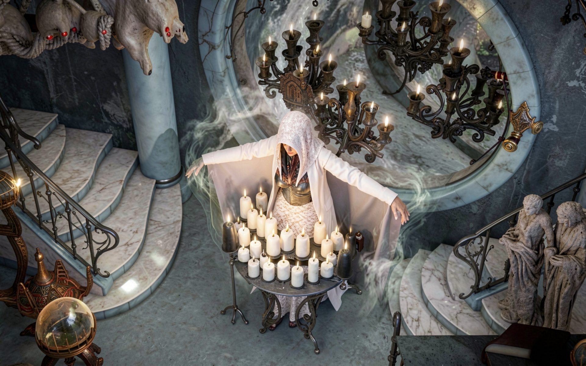 Жрица в белом одеянии среди свечей