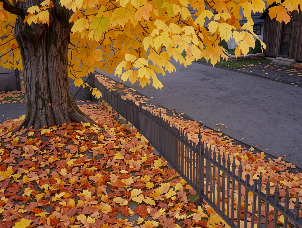 Осенний клен с желтыми листьями у забора