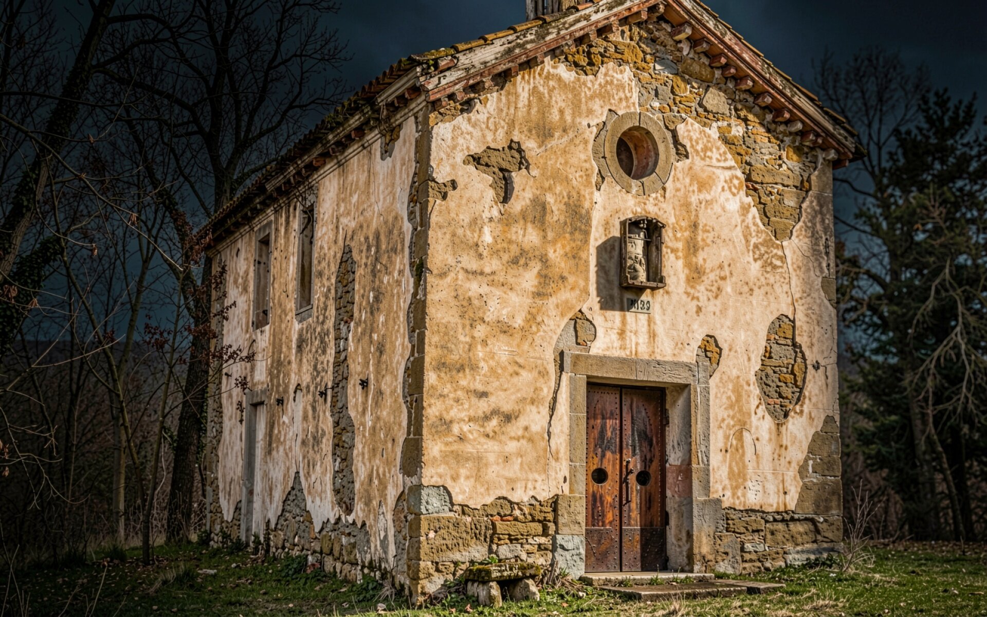 Заброшенная каменная часовня в темном лесу