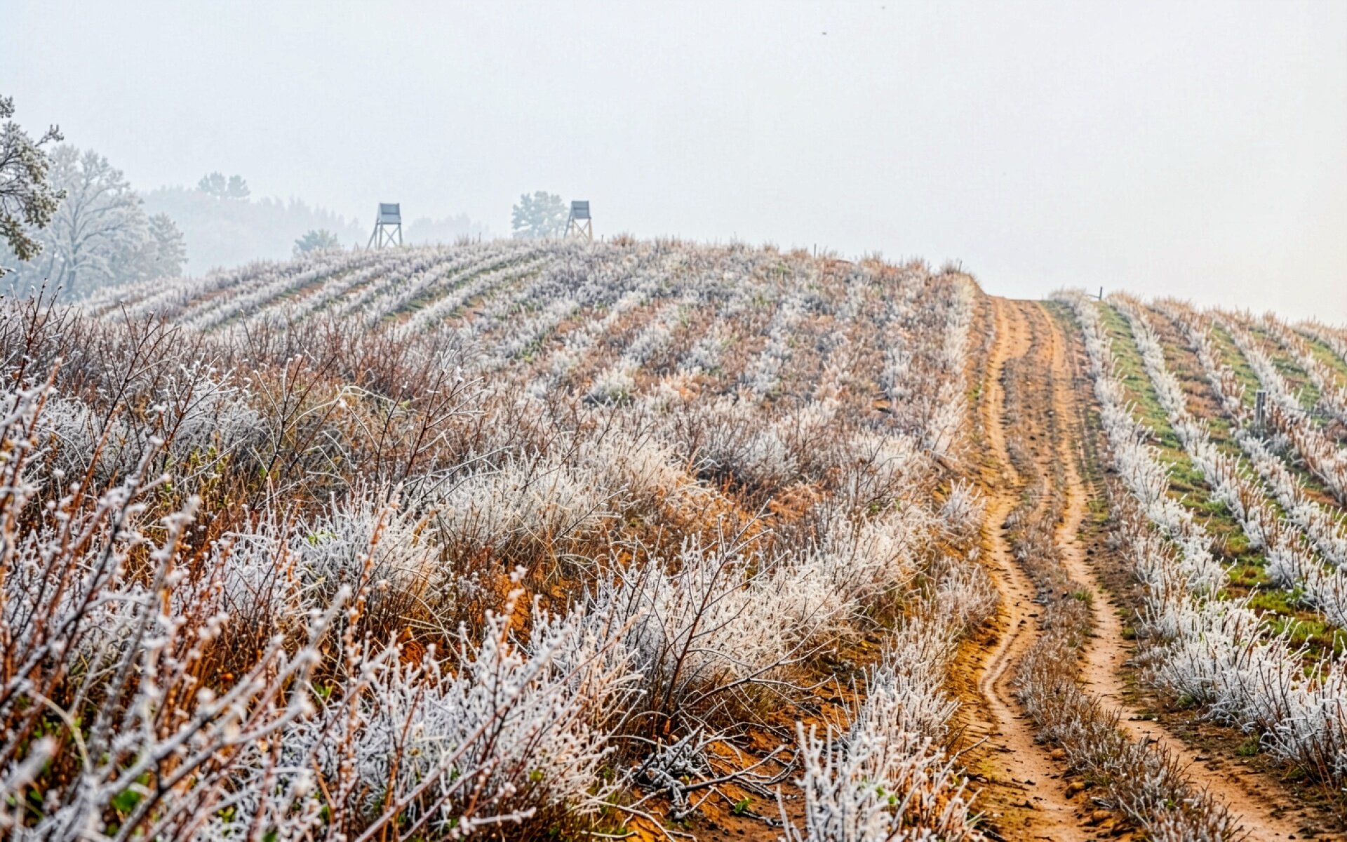 Заиндевевшее поле с грунтовой дорогой в тумане