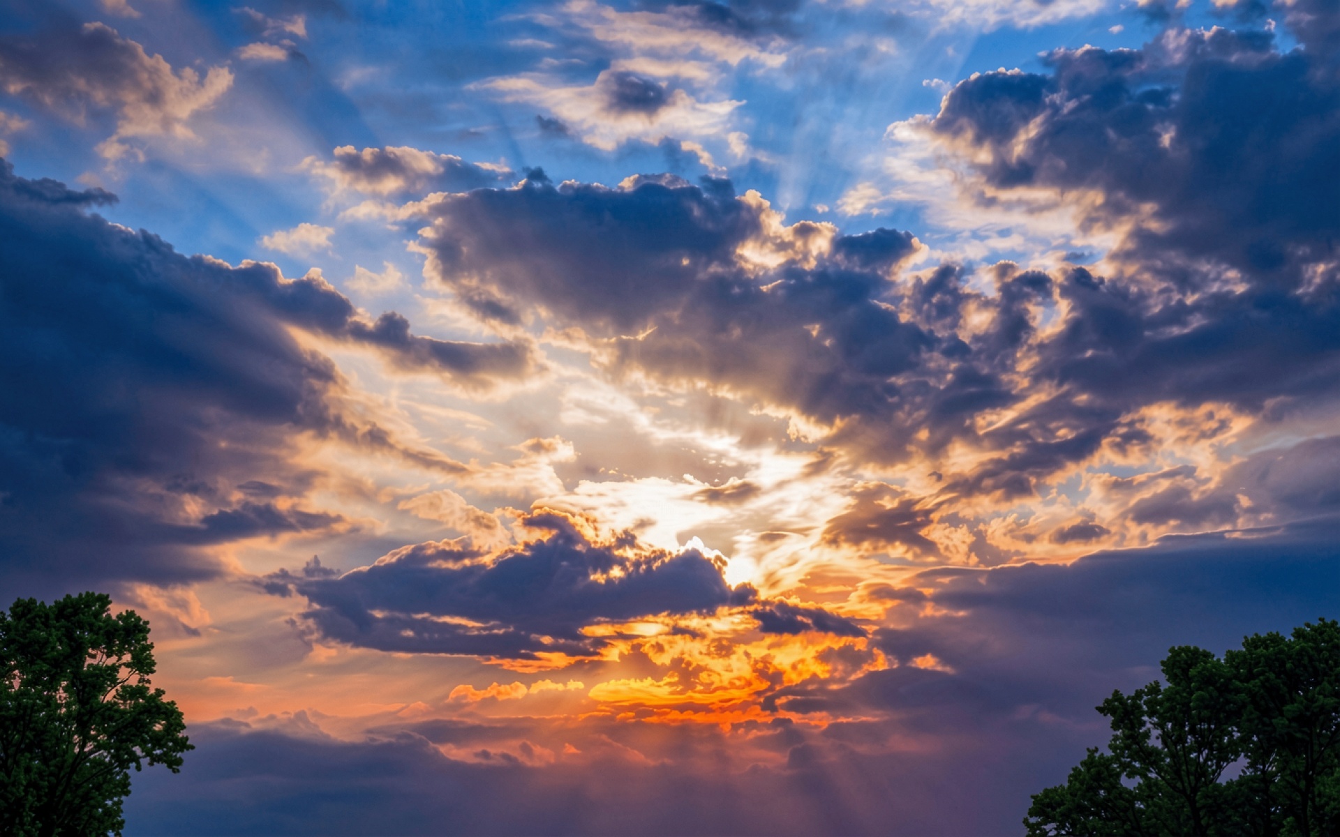 Закат в грозовом небе с золотыми лучами