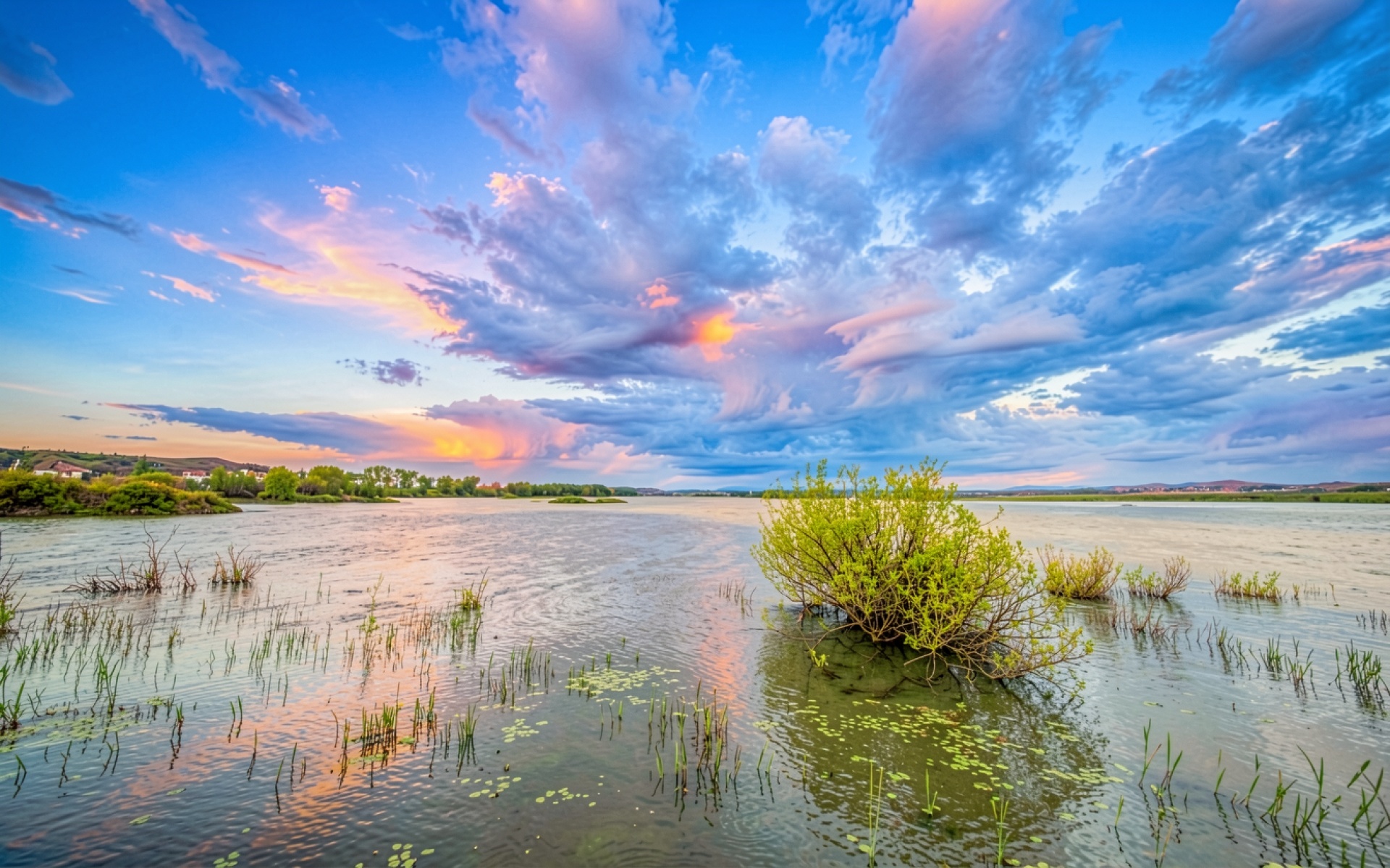 Закат над рекой с зеленым кустом