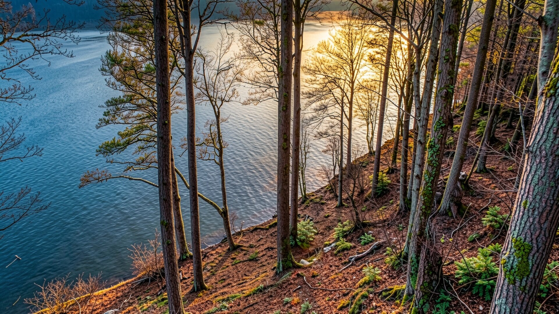 Осенний лес у синего озера закат
