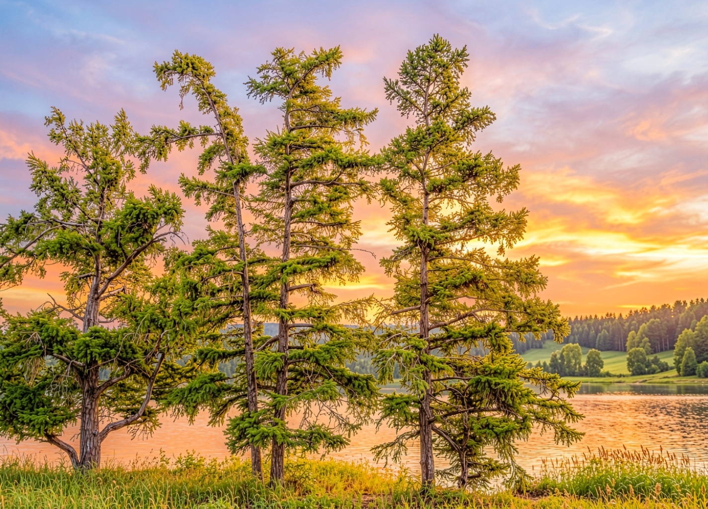 Три хвойных дерева на берегу озера закат