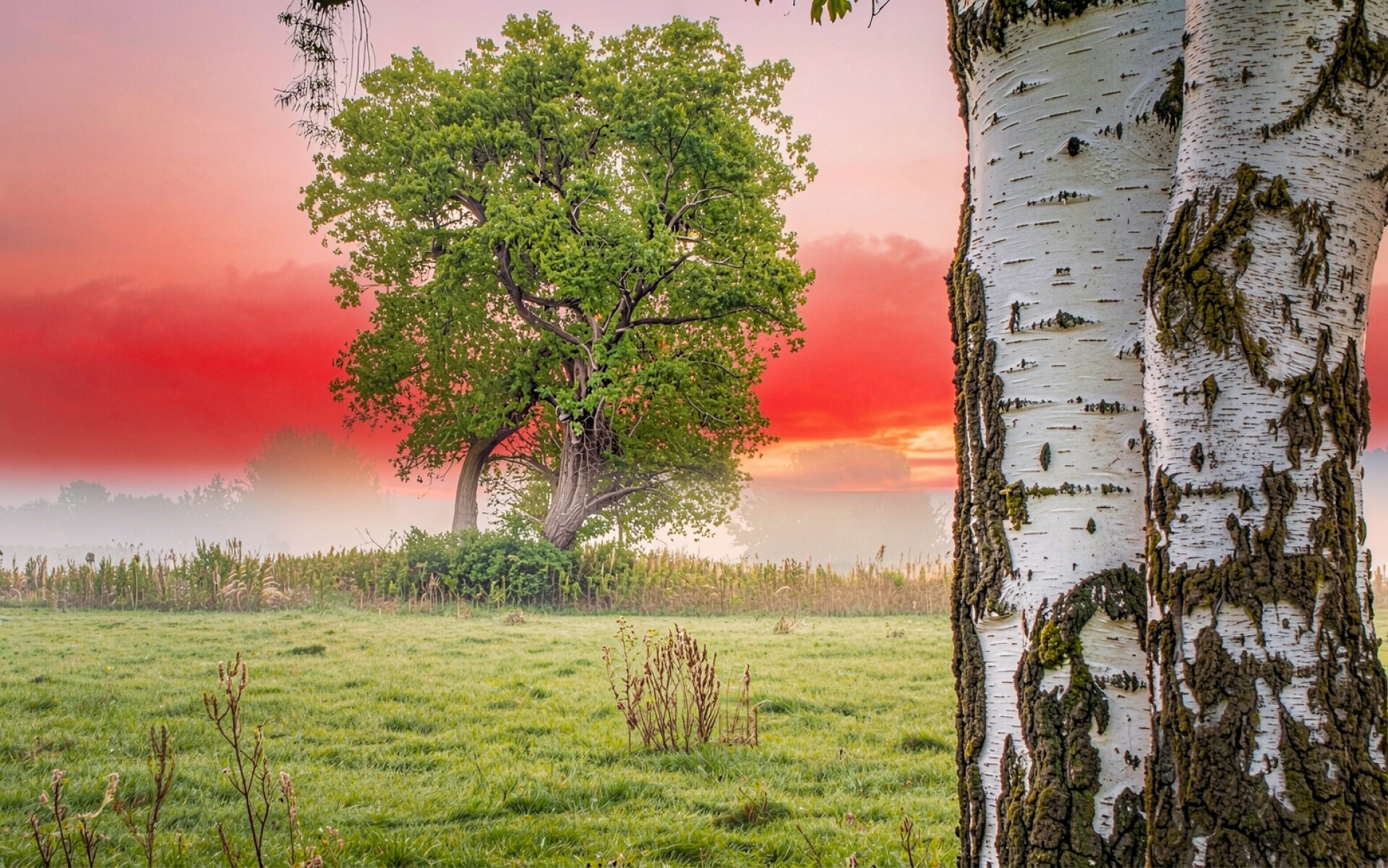 Белая береза в поле на закате