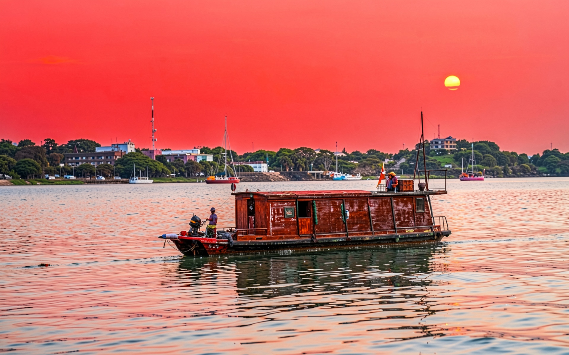 Деревянная лодка на реке в красном закате