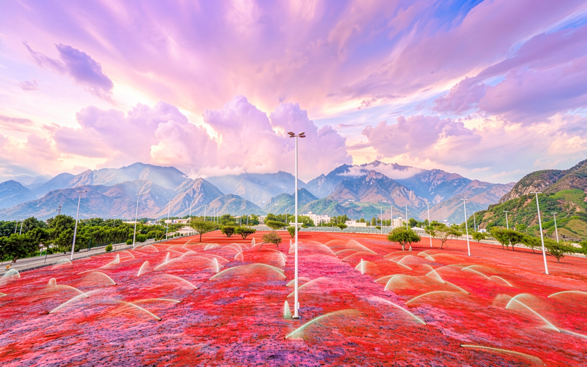 Поле красных цветов с горами на закате
