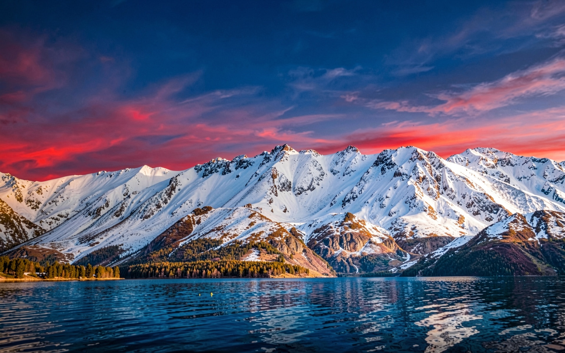 Заснеженные горы у озера на закате