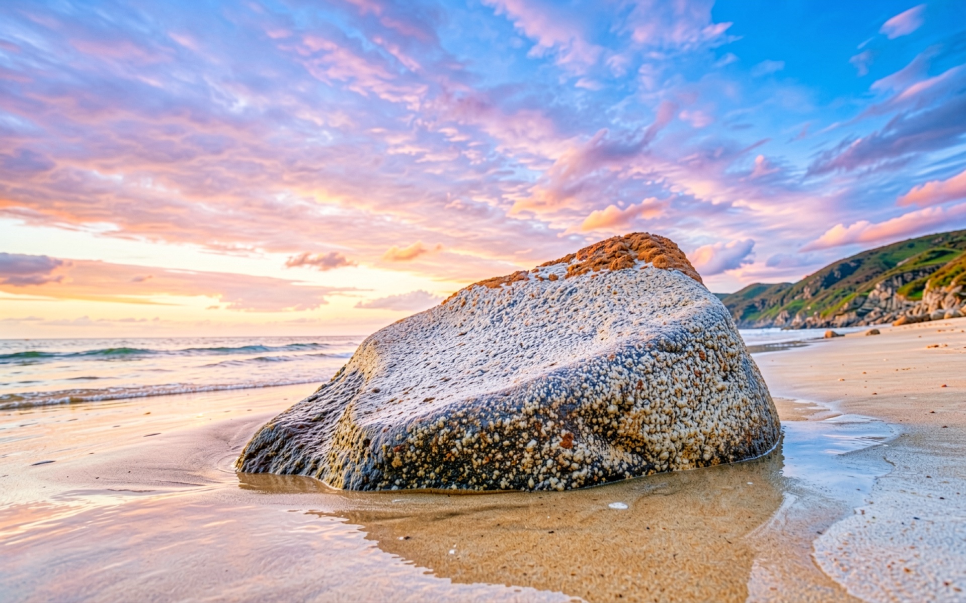 Серый валун на песчаном пляже в закате