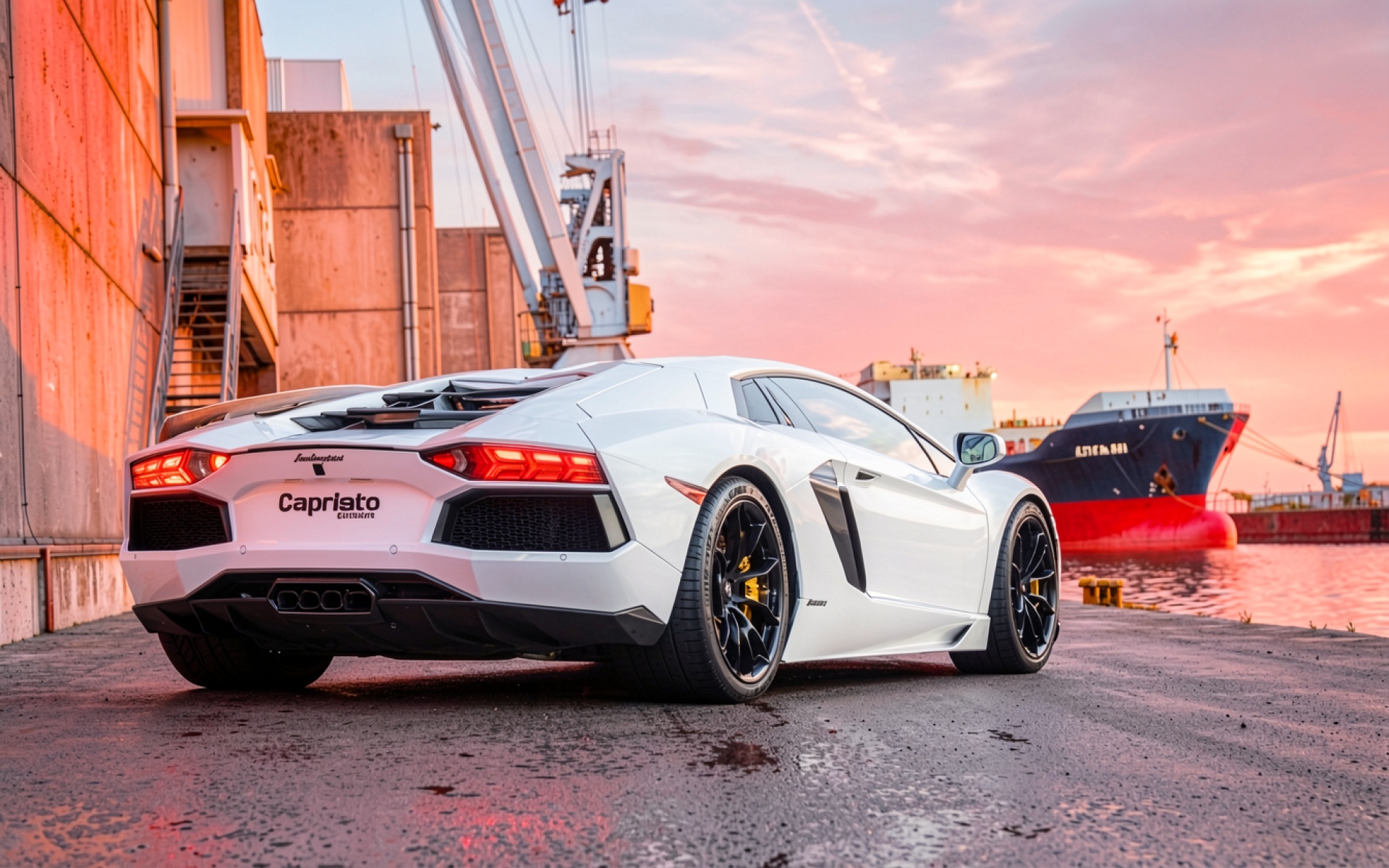 Белый суперкар Lamborghini в порту на закате