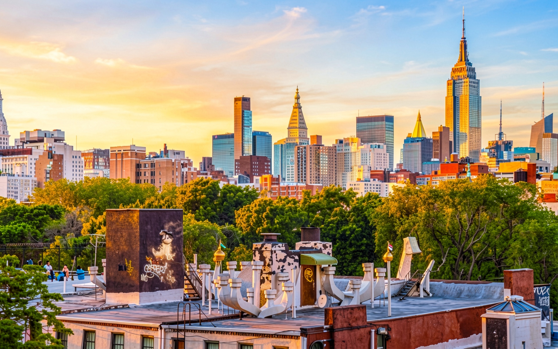 Панорама Нью-Йорка с Эмпайр-стейт-билдинг в закатном свете
