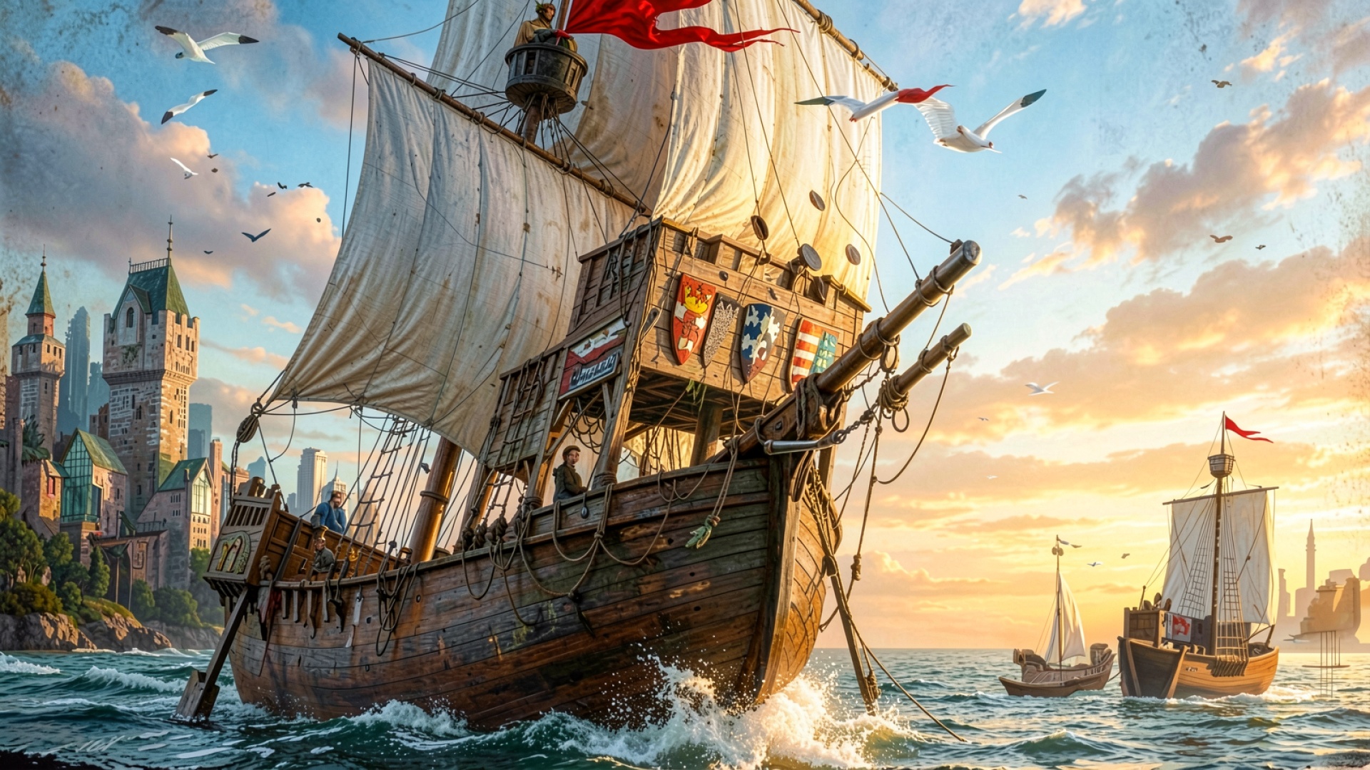 Парусный корабль в закатном море замок