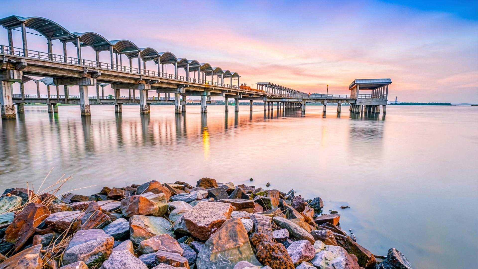 Длинный бетонный пирс в розовом закатном небе