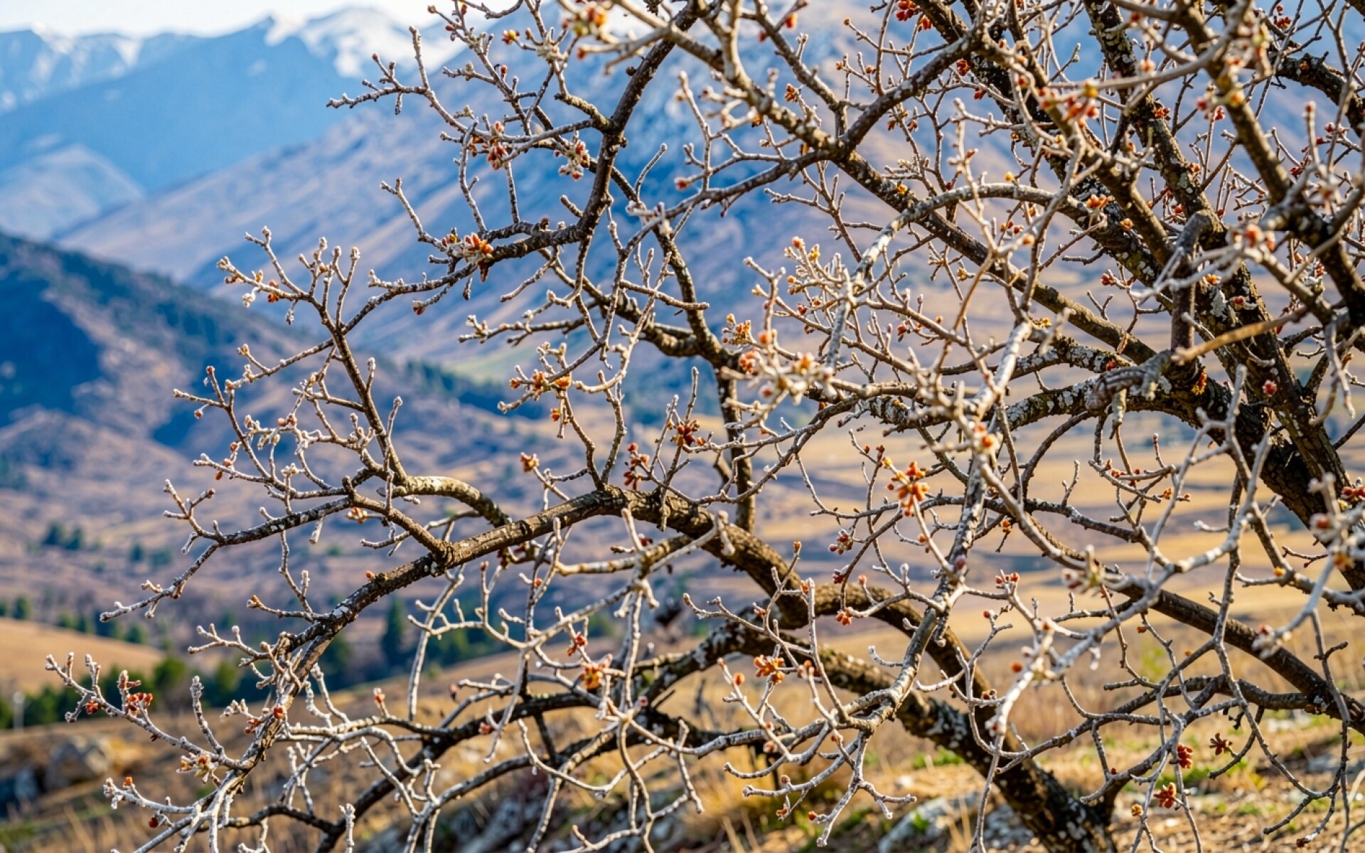 Замерзшие ветви дерева в зимних горах