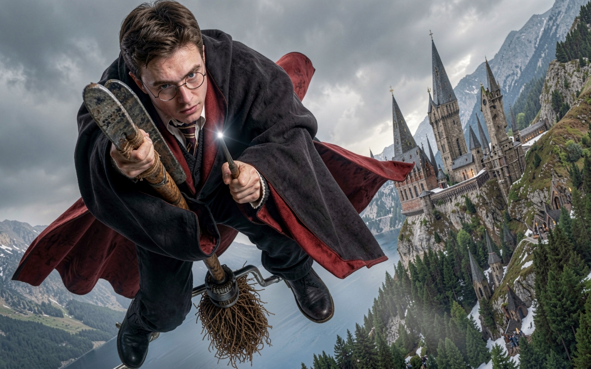 Гарри Поттер на метле у замка Хогвартс