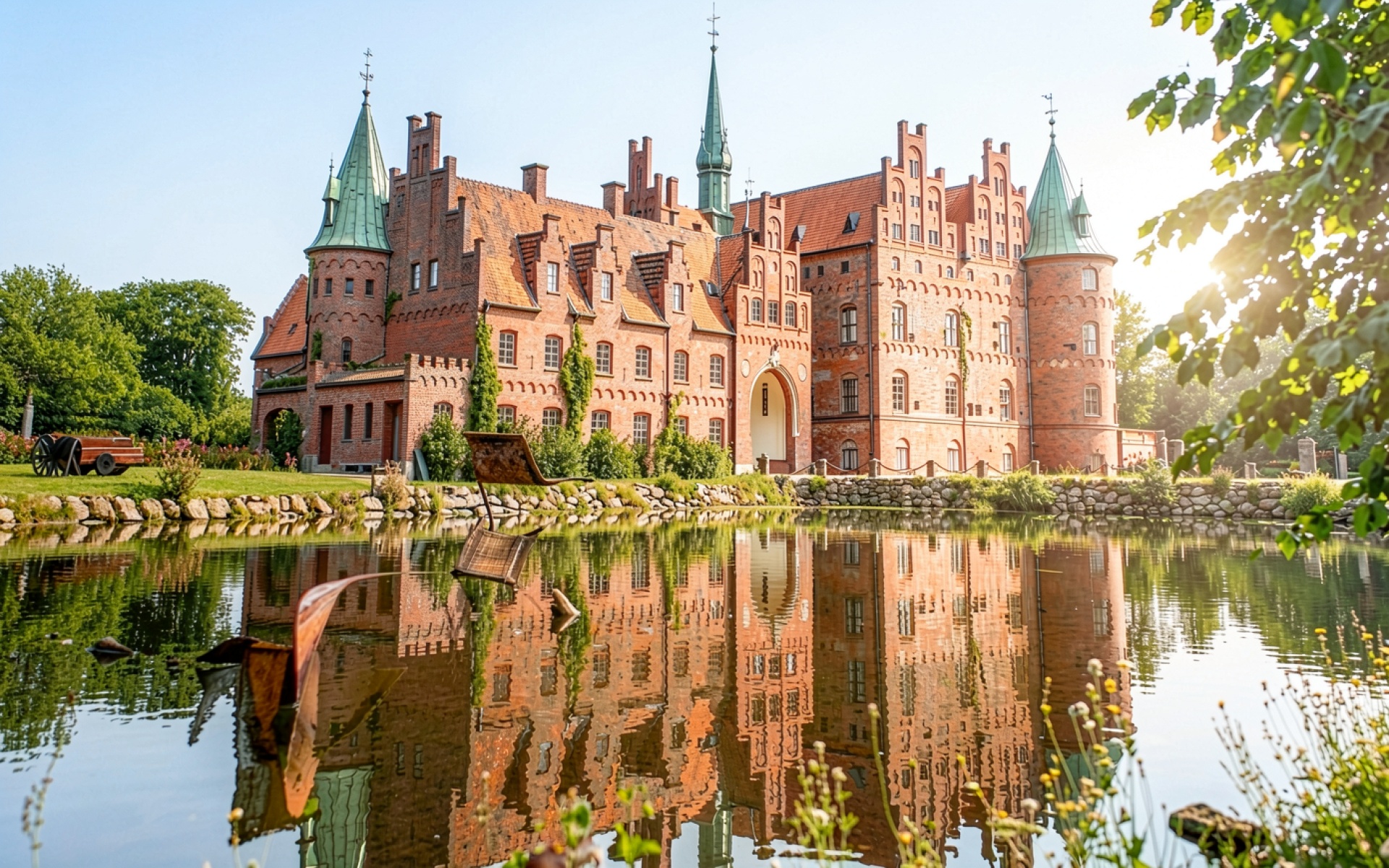 Красный кирпичный замок у зеркального озера