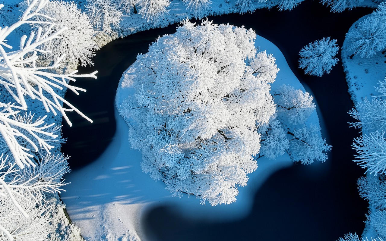 Заснеженное дерево на острове в темной реке