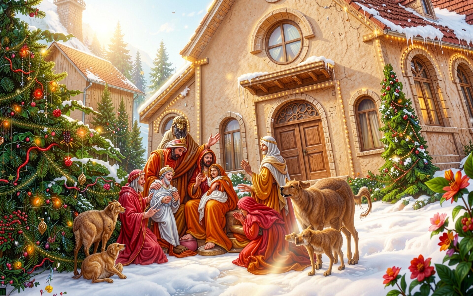 Сцена Рождества Христова в зимнем заснеженном поселении