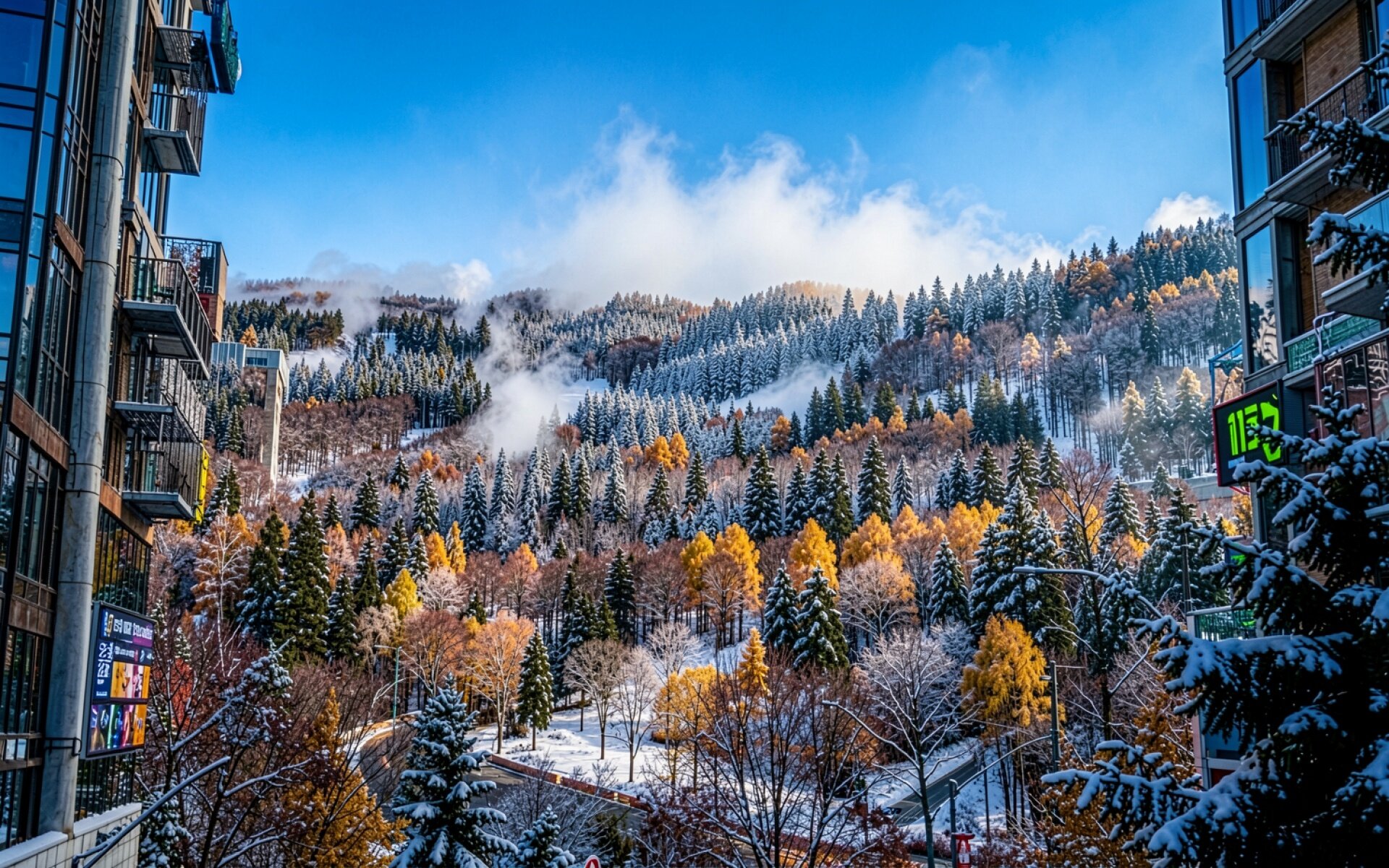 Заснеженный хвойный лес с осенними деревьями