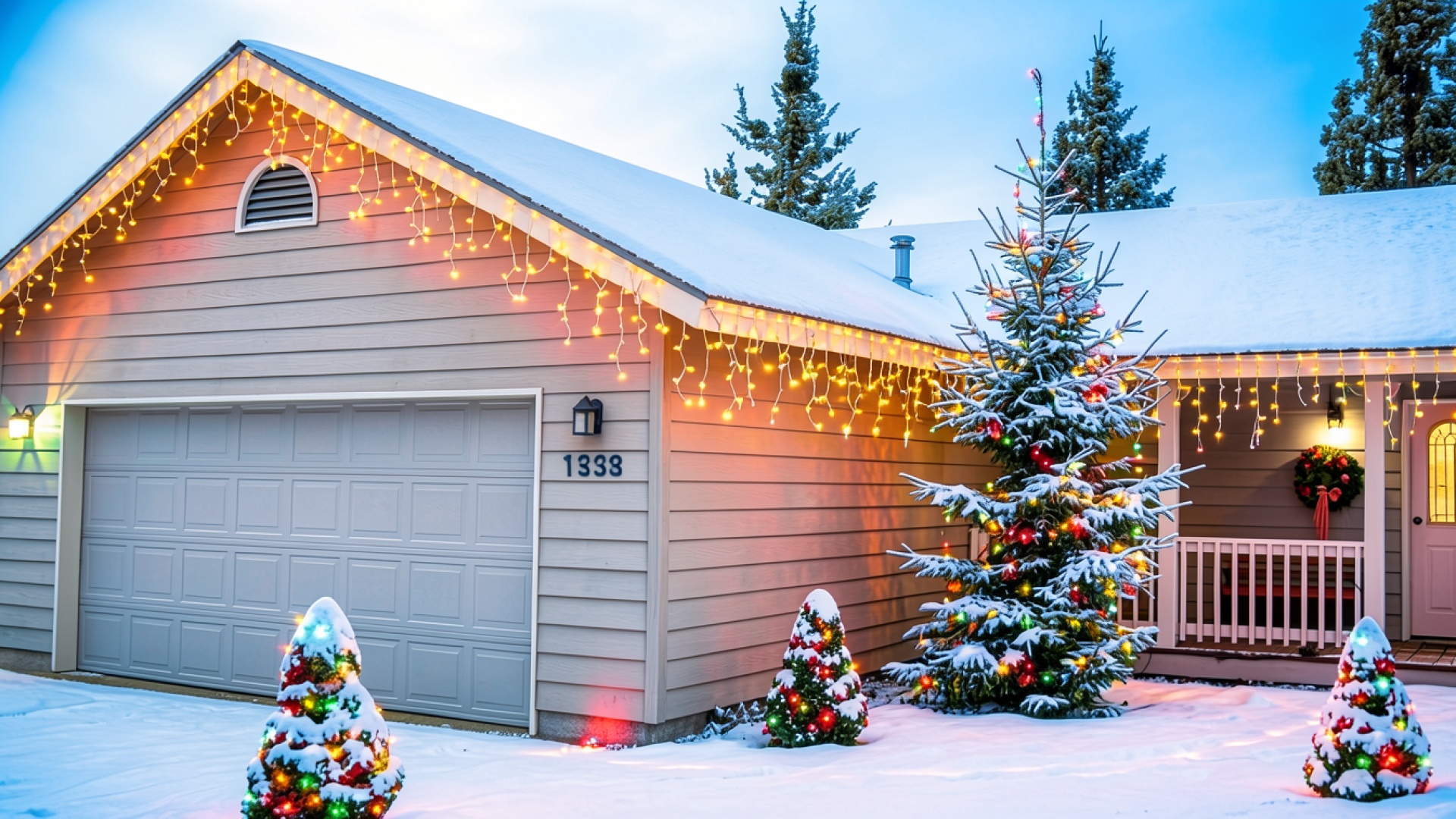 Заснеженный дом с новогодними огнями вечером