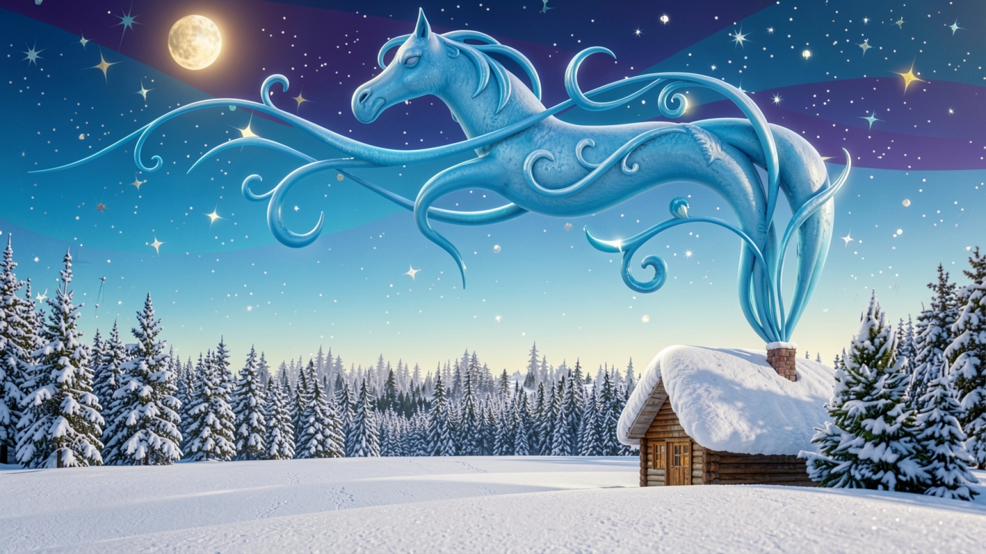 Голубой призрачный конь над заснеженным лесом