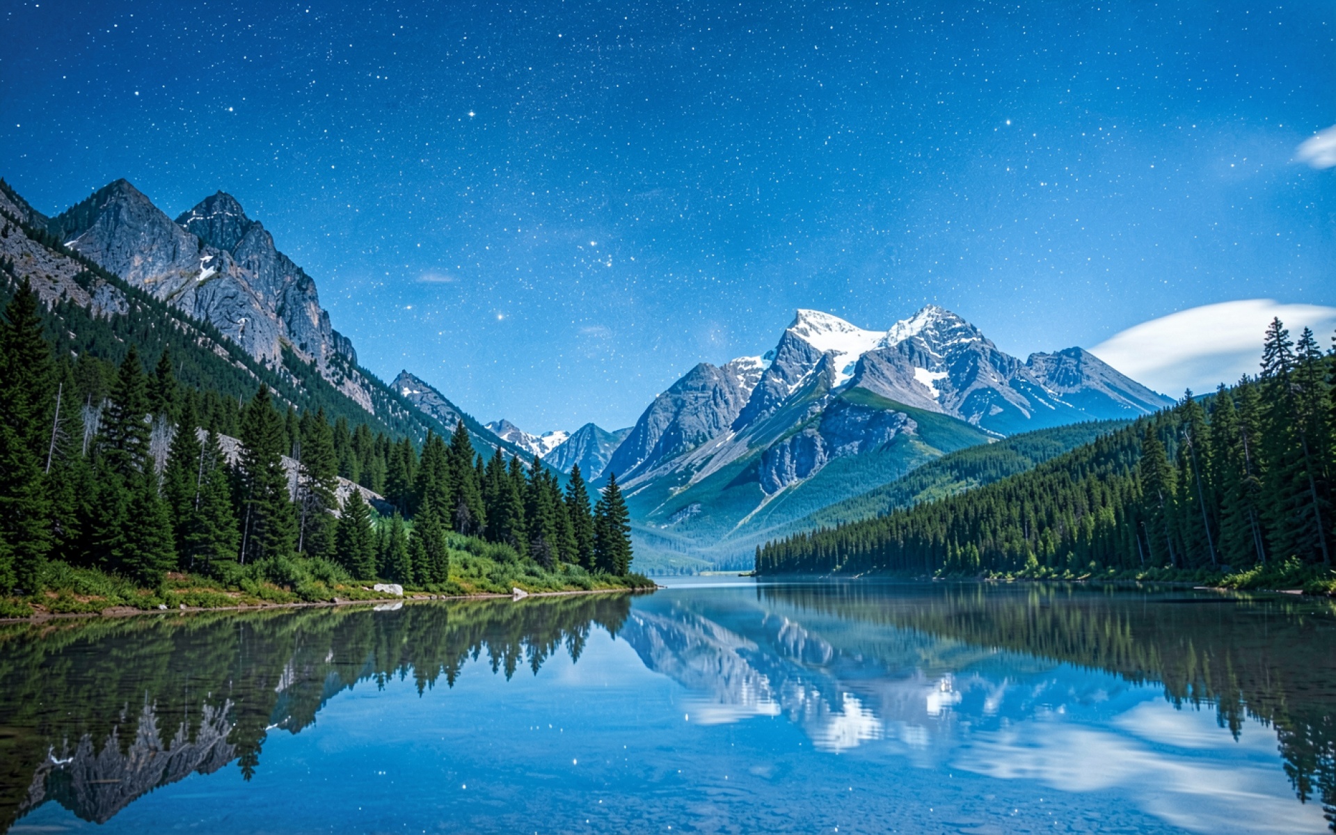 Звездное небо над заснеженными горами и озером