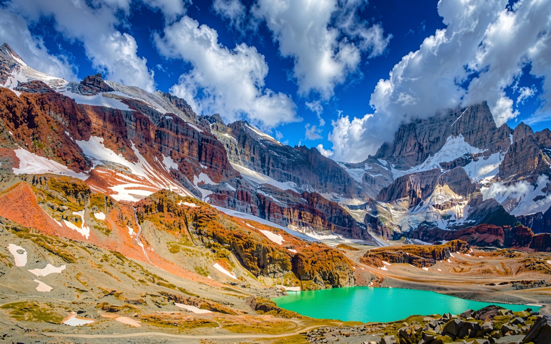 Бирюзовое горное озеро в окружении заснеженных скал