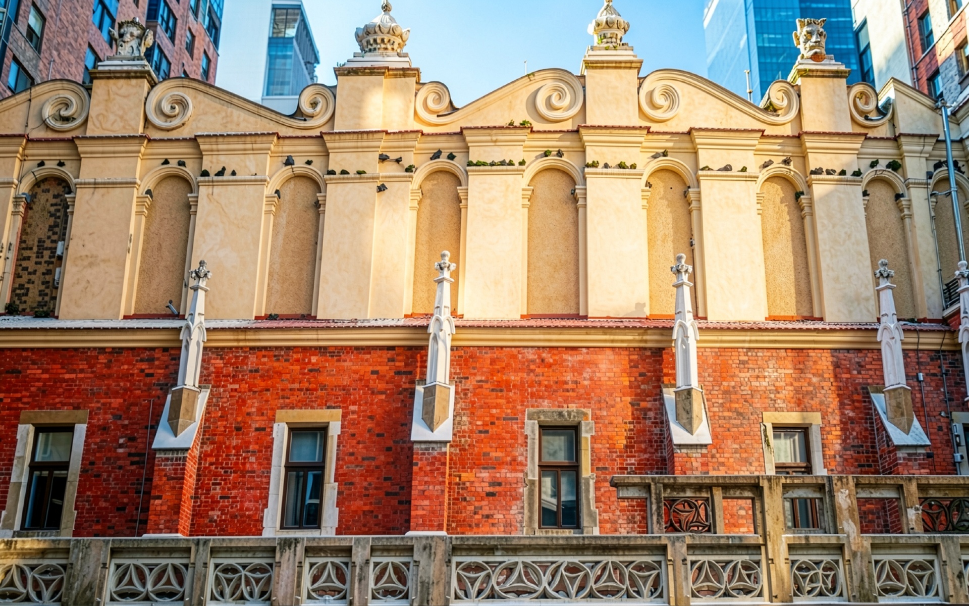 Старинное здание из красного кирпича с белым декором
