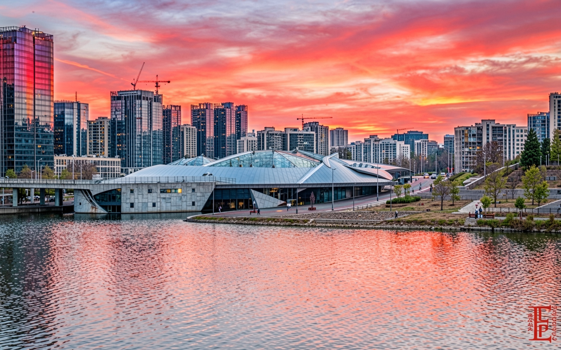 Современный город с футуристичным зданием на закате