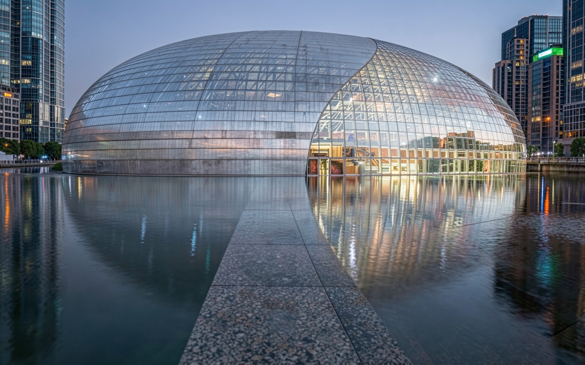 Стеклянный купол здания в вечернем городе
