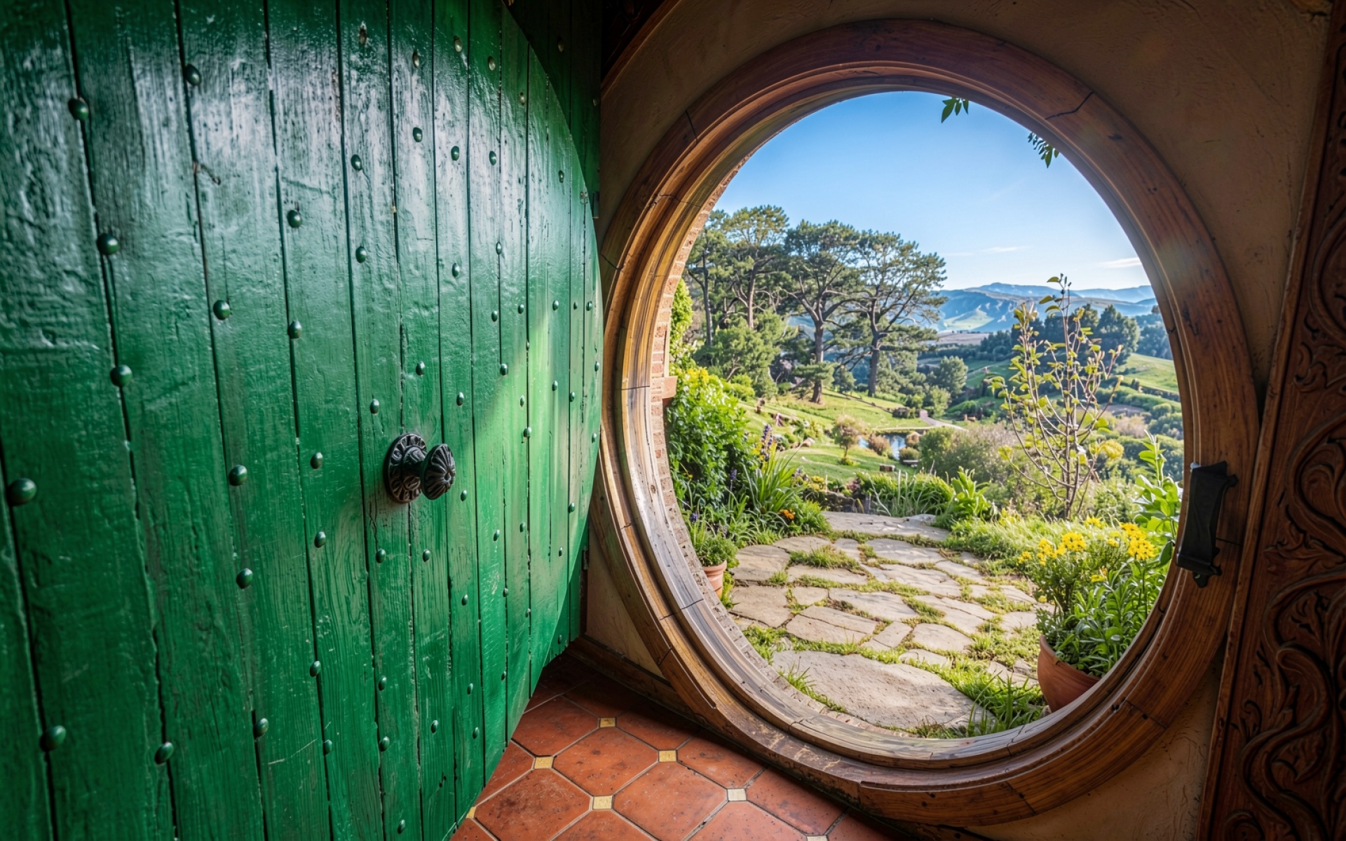 Зеленая круглая дверь хоббита в Шире