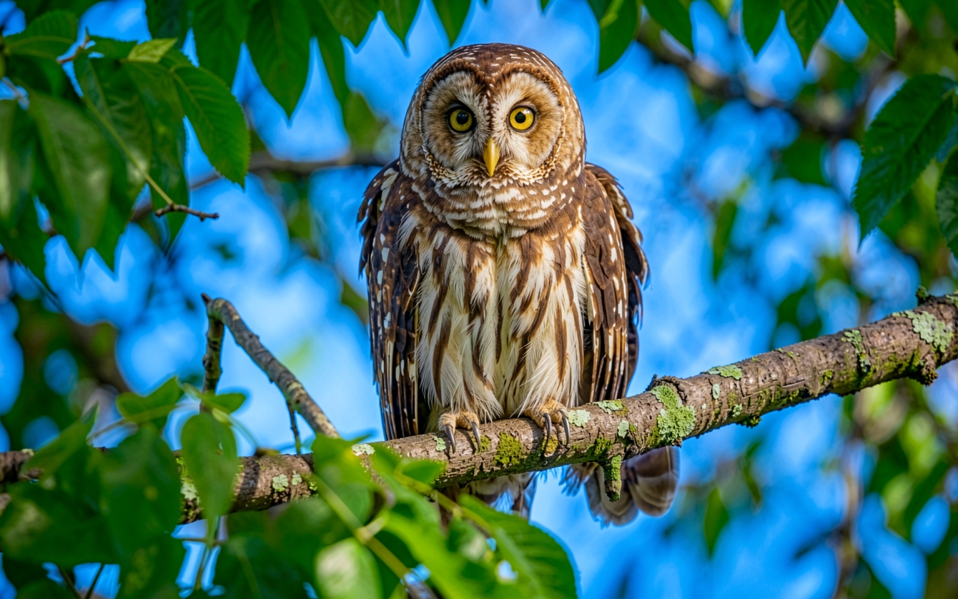 Коричневая сова на ветке зеленого дерева