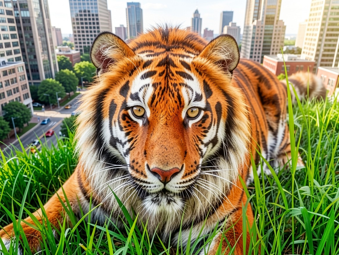 Рыжий тигр в зеленой траве городского пейзажа