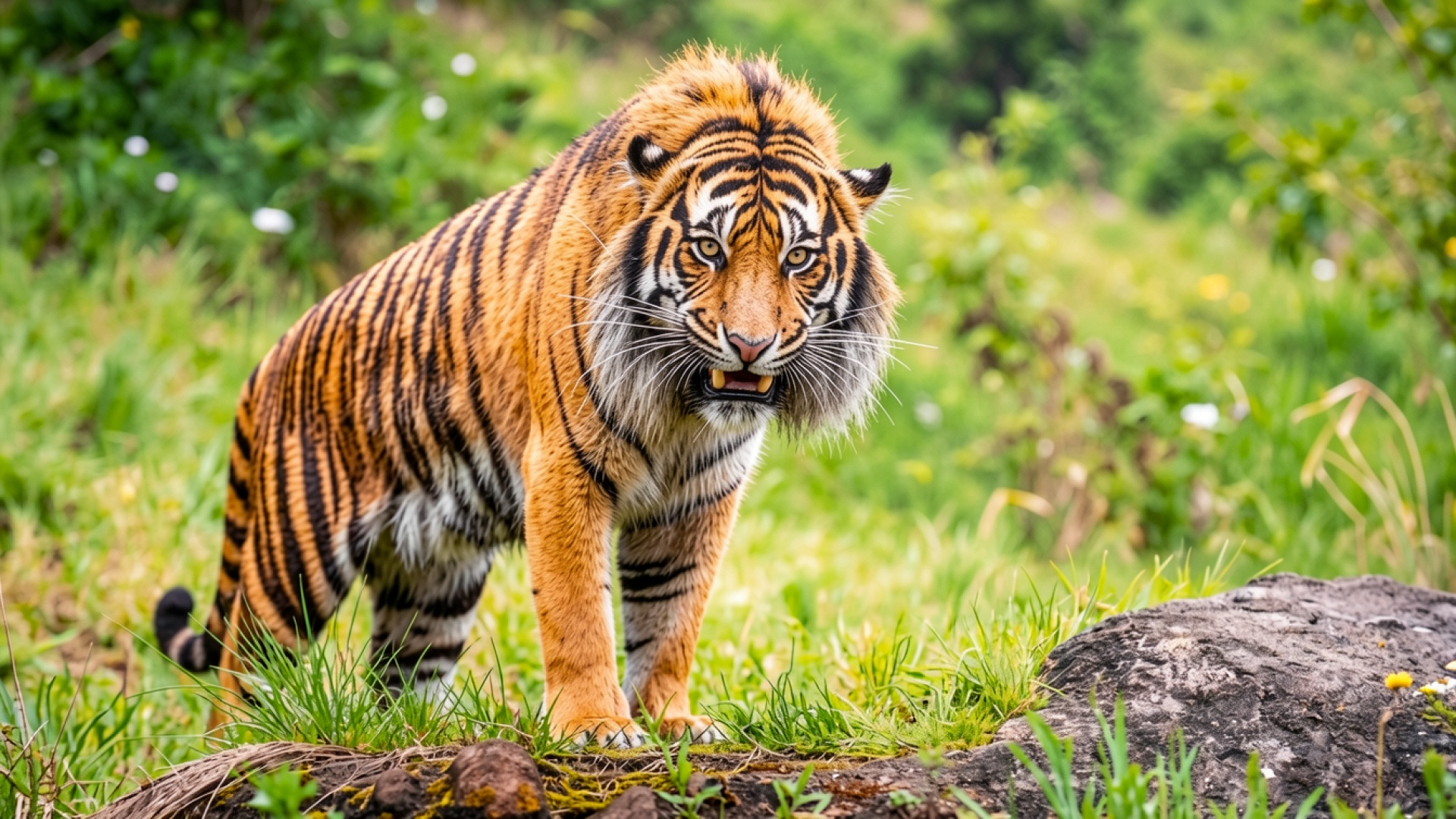 Бенгальский тигр в зеленой траве джунглей