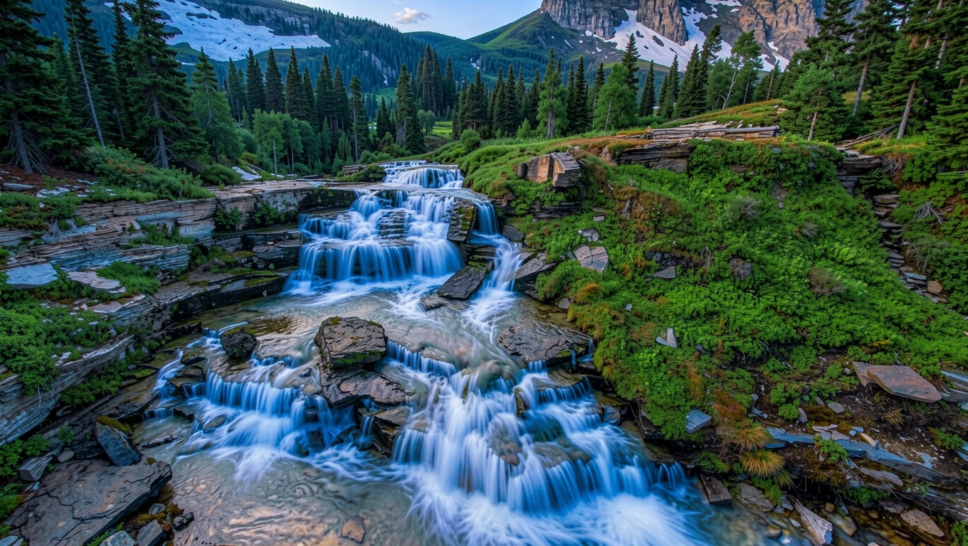 Горный водопад в зеленом хвойном лесу