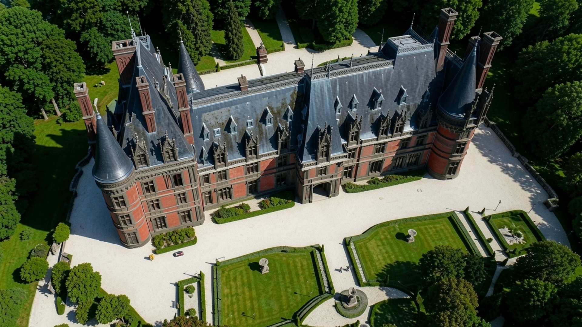 Замок из красного кирпича в зеленом лесу