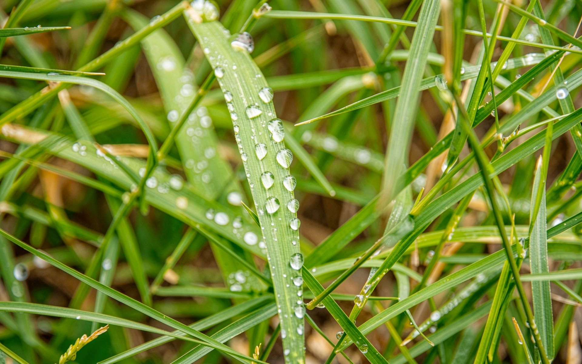 Капли росы на зеленом листе травы